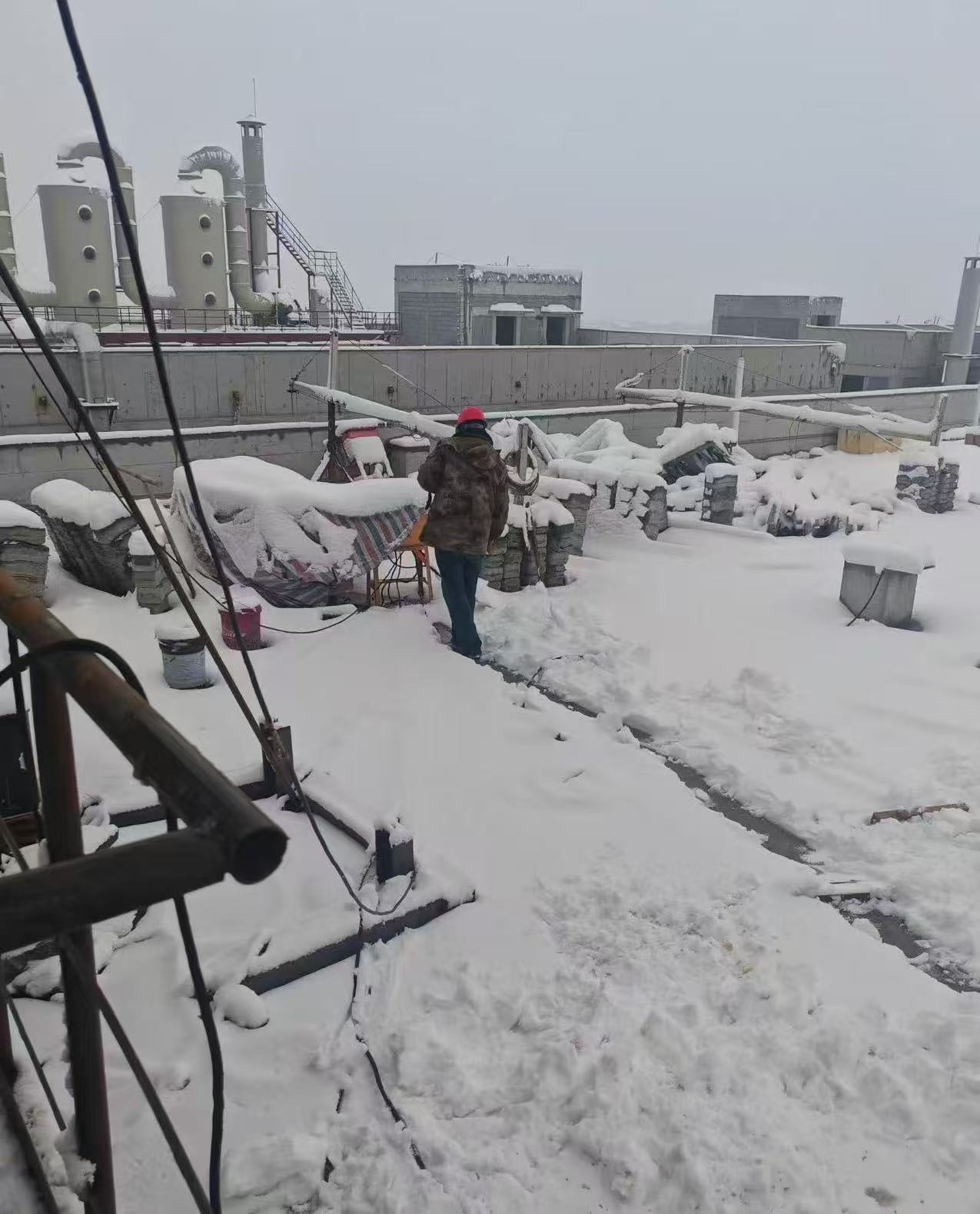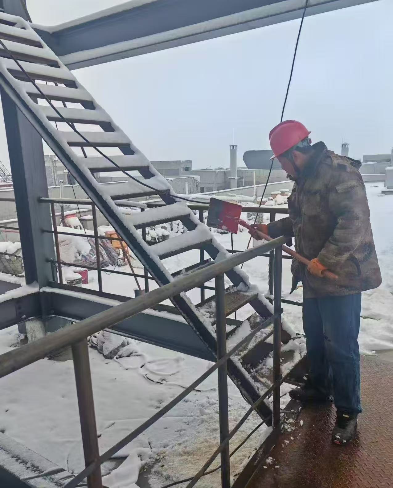 3月2日,石家庄突降大雪,给这个本来回暖的春天来了个措手不及,也给项目现场的施工进度造成了不小的阻碍。为了不影响业主按时投产,汉创人一大早,冒着寒风 争分夺秒在楼顶做清障作业。
