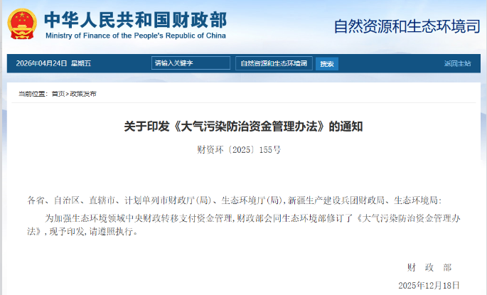 日前,财政部印发《大气污染防治资金管理办法》(财资环〔2025〕155号),(以下简称《办法》),共5章23条,设总则、资金使用范围、资金分配和管理、绩效管理和监督检查、附则等内容。