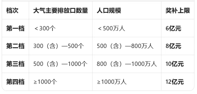 “美丽蓝天”建设项目按总投资额的60%予以奖补,但根据城市大气主要排放口数量和人口规模,设置6亿—12亿元四档奖补上限: